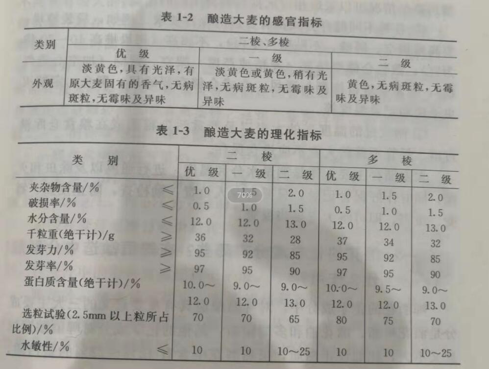 鑒別原料大麥的質(zhì)量主要從外觀質(zhì)量、物理檢驗和化學檢驗三個方面著手。其質(zhì)量標準分為感官指標和理化指標兩大類,并依此將大麥分成三個等級(表1-2、表1-3)。