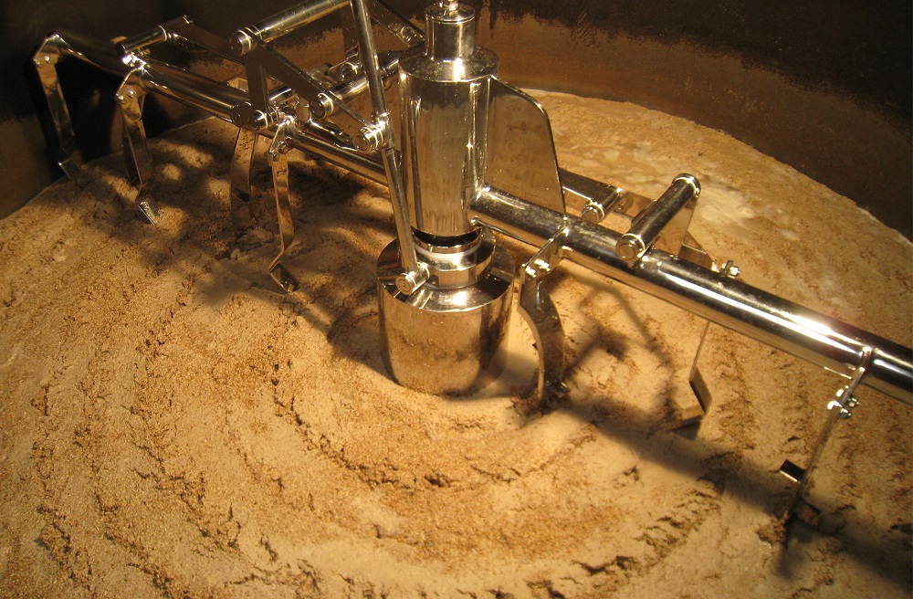 過(guò)濾罐中配備的耕刀裝置主要作用是用于疏松糟層,根據(jù)過(guò)濾壓差來(lái)上下升降,不是用來(lái)攪拌的。耕刀在過(guò)濾槽中轉(zhuǎn)動(dòng)的速度很慢,十幾分鐘一圈。醪液泵入過(guò)濾罐后需要靜置15-20分鐘左右,麥皮會(huì)沉降,形成麥糟層。麥糟層底部主要是麥芽的粗粒和重粒;中間含量最多的是麥糟,即麥皮;上層則是醪液析出的蛋白質(zhì)和麥碎等輕質(zhì)顆粒。靜置時(shí)也要注意醪液的溫度,應(yīng)注意保溫。